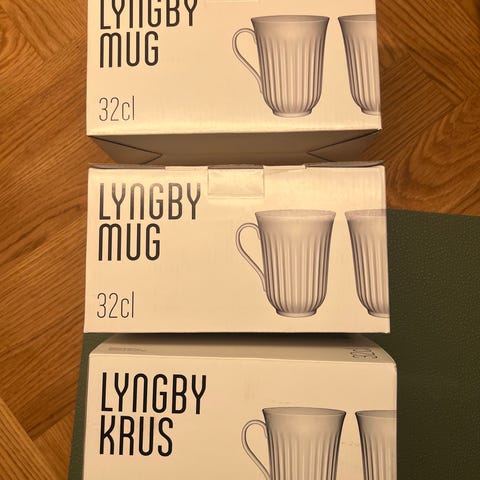 6 stk. helt nye 32 cl lyngby krus i hvid porcelæn med lyngby kasse.