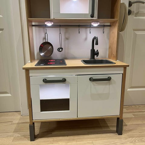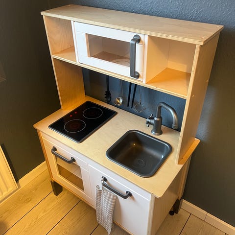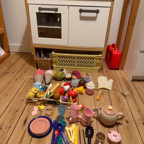 Ikea Duktig legekøkken med en masse legemad og udstyr.