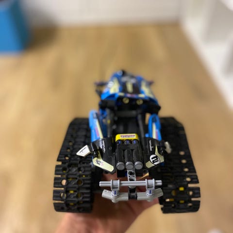 LEGO Technic fjernstyret bil med larvefødder, blå og gul farve, lavet af plastik. Modellen er designet til at efterligne en terrængående bil med larvefødder for bedre fremkommelighed.