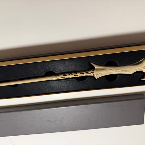 Draco Malfoy tryllestav fra Harry Potter-serien. Fremstillet i materiale der efterligner træ, med detaljer der repræsenterer karakterens unikke design. Leveres i original æske, velegnet til samlere og fans af serien.og Harry Potter stav dumbledore stav og hermione granger stav alle stavene 450 alle koster 400-500 ny ca pr stj