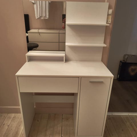 Sminkebord med hvid metalramme og glasbordplade. (spejl med lys omkring følger IKKE med).