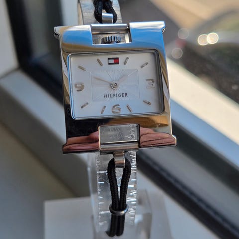 Tommy Hilfiger dameur fra 2012 med hvid urskive og hvid rem. Uret har tydelige tal og minutmarkeringer, samt en sølvfarvet ramme omkring urskiven. Remmen er lavet i et lyst materiale, som fremstår som plastik eller silikone. Uret leveres i original emballage med tilhørende dokumentation.