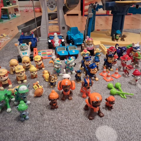 Paw Patrol børnetøj og legetøj bestående af flere figurer og forskellige køretøjer i forskellige farver. Legetøjet er egnet til børn og inkluderer figurer med tilhørende køretøjer i plastikmateriale.