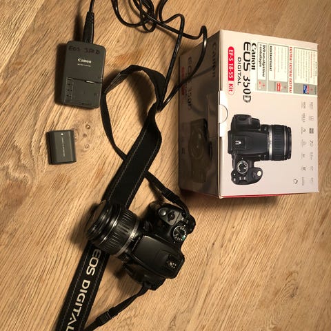 Canon EOS 350D Digital kamera med EF-S 18-55mm objektiv. Kameraet leveres med original taske, linsebeskytter og tilslutningskabel. Objektivet har en brændvidde på 18-55mm og 1: 3.5-5.6II. Kameraet er velegnet til fotografering med udskifteligt objektiv. Memorycard medfølger ikke.