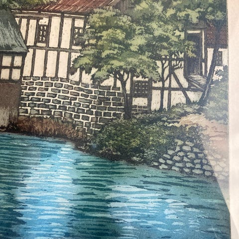 Billede af landejendom. Stort koloreret luftfoto i ramme, fra begyndelsen af 50'serne.
