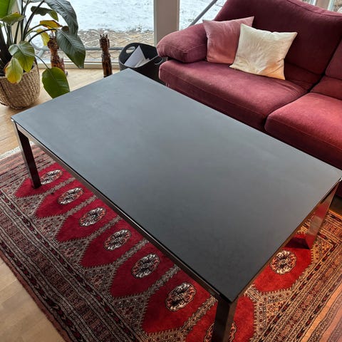 Sofabord, sort linoleum med ben i børstet krom. Dansk design fra Ansager. Brugsspor, men velholdt. H:51, L:140, B:80. (Nypris kr. 7.000)