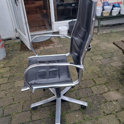 Meget pæn og velholdt kontor stol i læder look, der medfølger arm læn med der aldrig har været monteret. Understellet er lavet af metal.