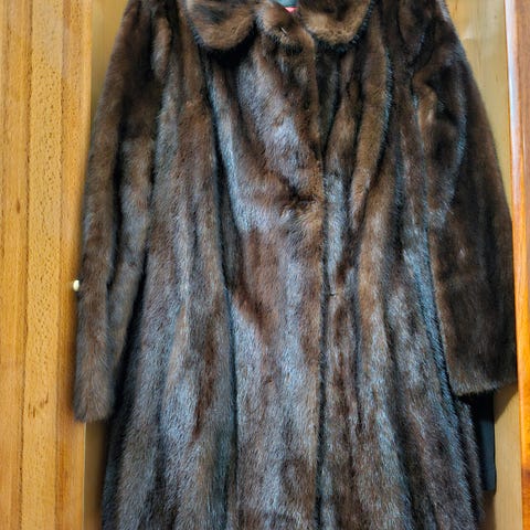 Meget velholdt frakke i minkpels; syet hos buntmager Margit pels af skind fra Kopenhagen Fur