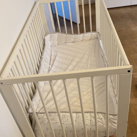Jollyroom Bedside crib. Sengen inkluderer en Cocoon madras 100% øko bomuld. Sengen har en sikkerhedsrem så du kan spænde sengen fast, så den ikke flytter sig i løbet af natten. Sengen kan justeres i flere højder så den passer til jeres egen, og overflytning kan gøres nemt og smidigt. Brugt meget få gange. Har enkelte steder hvor malingen er ridset af.