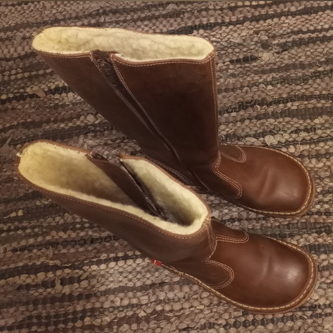 Støvler i størrelse 38 lavet af brun læder. Støvlerne har højt skaft og 5 cm hæl, egnet til dagligt brug.