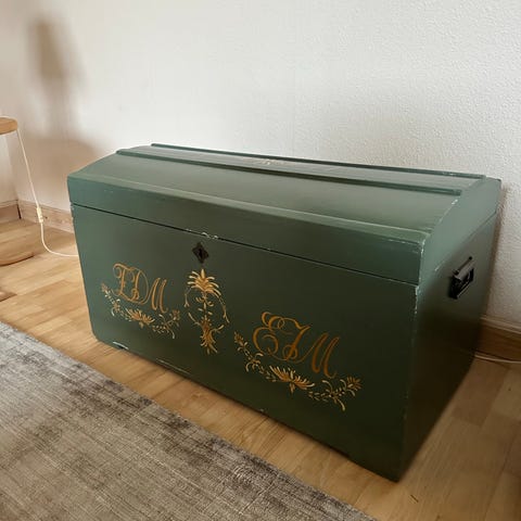 Antik trækiste med grøn farve og håndmalede blomster samt initialerne AP og APN. Kisten har metalbeslag og hængsler, og indvendigt er den malet rød. Kisten kan bruges til opbevaring af tekstiler eller andre genstande. Malet af lokal maler Arne Berg. Fået for 38 år siden..