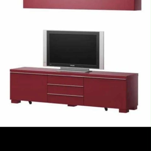 IKEA TV-møbel med flere opbevaringsrum, herunder 2 skuffer med aftagelig indsats til DVD. Glaslåger til overskab med lys og 2 glashylder. Lågerne er grå