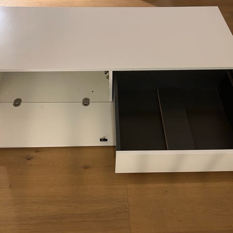 Møblet er hvidt og designet til opbevaring af elektronik og tilbehør i stuen.