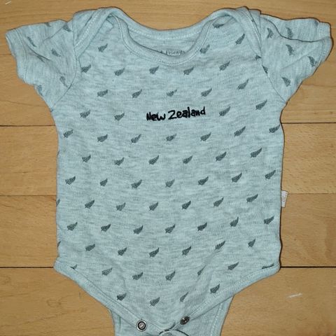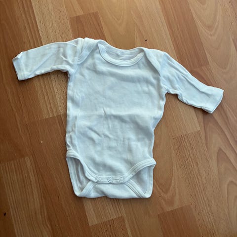 Hvid body med bjørn, blåstribet krave og knapper i bag. Brugt, men fremstår i god stand.