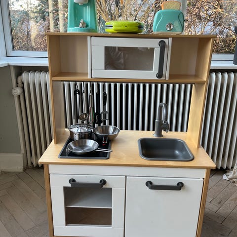 IKEA børnekøkken med tilbehør, inklusiv komfur, vask, ovn og diverse køkkenredskaber og madvarer til leg. Køkkenet er hvidt med træfarvet bordplade og har skabe og hylder til opbevaring af legetøj.