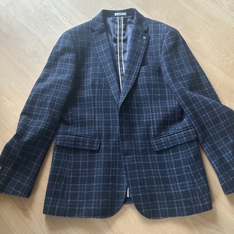 Flot mørkeblå habitjakke med tern i stoffet. Helt nyt fra lagersalg. Dog uden prismærke. Str 50. Virkelig flot. Fra ikke ryger.