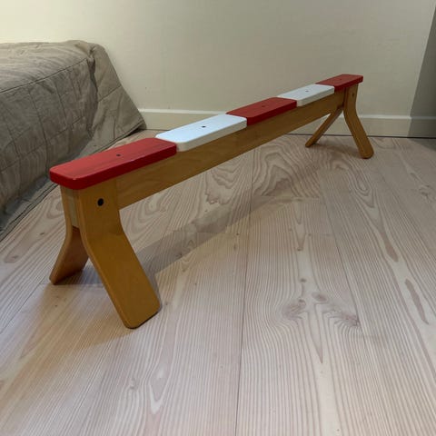 Den har ikke de originale træde plader men proffesionelt skåret plader i træ man selv kan male. Pladerne er ikke skruet fast.