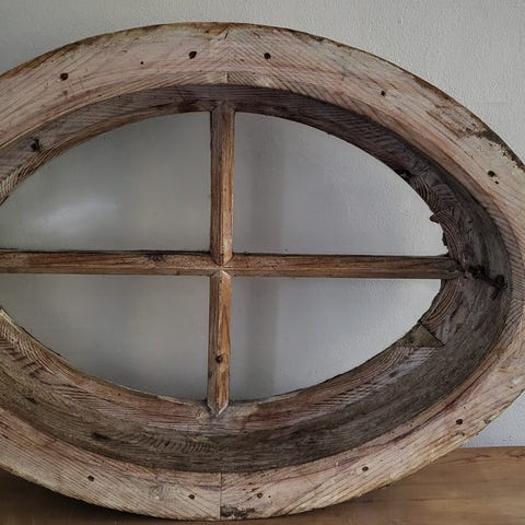 Rundt gammelt trævindue med fire ruder