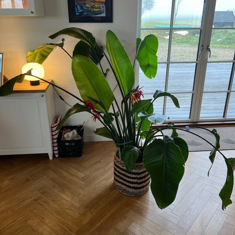 Strelitzia Nicolai stueplante med store grønne blade i sort potte. Velegnet som dekorativ indendørs plante, der kan bidrage til et grønt og naturligt miljø i hjemmet. Der er to i en potte og de mangler en omplantning og at blive ordblind støttet.