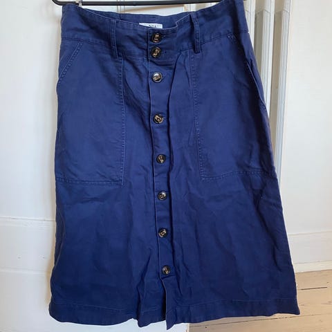 Noa Noa nederdel i størrelse XL, blå farve, fremstillet i bomuldshør. Nederdelen har lommer og lynlås bagpå. Designet i A-facon m linning og lyst foer.