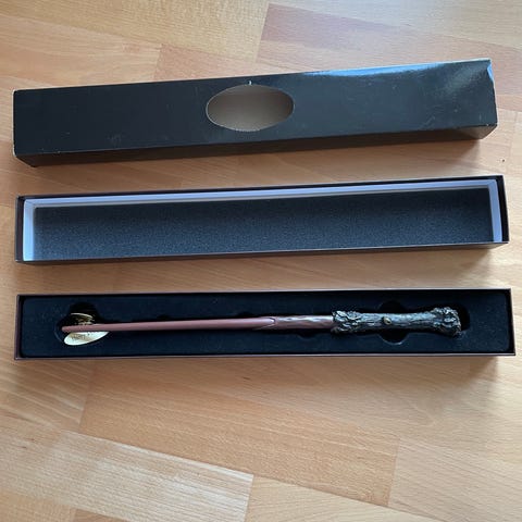Harry Potter Gryffindor tryllestav og tørklæde sæt. Tryllestaven leveres i en æske med Harry Potter mærkning, og tørklædet har Gryffindor emblem. Sælges samlet. .