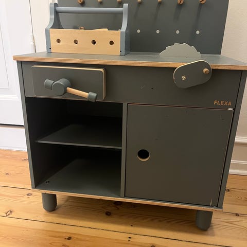 Flexa værktøjsbænk i grå med arbejdsbord og opbevaringsrum. Lille ridse. Og drejedims skal lige sættes på.