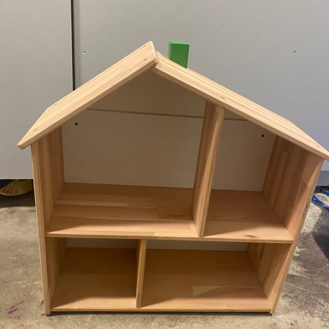 Gammelt håndbygget svensk dukkehus i træ med møbler