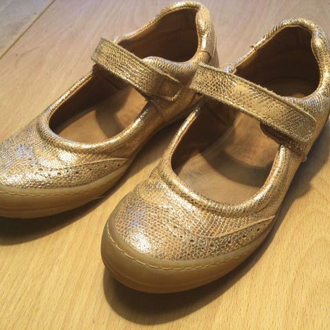 Ballerinasko, str. 24, Bisgaard, piger, Skønne guldfarvede tullesko. Brugt, men i god stand. Lidt afslidning af guldfarven på stroppen.
