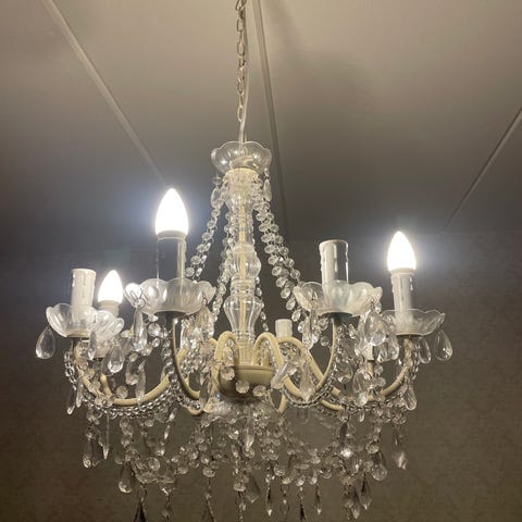Den har en elegant hvid/cremefarvet ramme og masser af fine, hængende prismer i glas, der giver et smukt lysspil, når lampen er tændt.