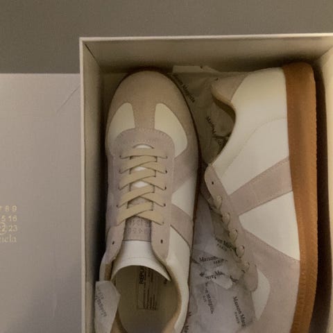 Maison Margiela Sneakers i størrelse 42. Skoene har en kombination af materialer i neutrale farver, primært beige og hvid. Designet er unisex og velegnet til daglig brug.