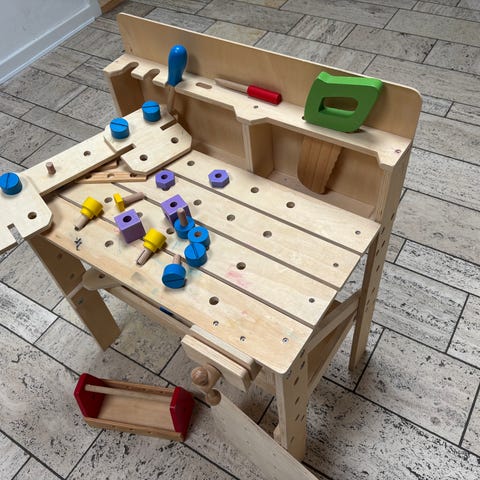 Sælger denne fine træ-værktøjsbænk til børn i robust kvalitet. Ideel til rolleleg og små håndværkere, der elsker at bygge og skrue.