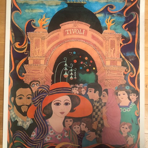 Vintage plakat med illustration af en kvinde iført hvid hat og handsker, omgivet af en stor buket røde roser. Baggrunden viser en byscene med bygninger og lys. Plakaten har en dekorativ og nostalgisk stil.