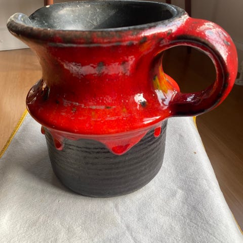 CXB Rød glaskande med tilhørende to glas. Kanden og glassene er røde med dekorative guldkantdetaljer. Sættet er lavet i glas og kan anvendes til servering af drikkevarer.