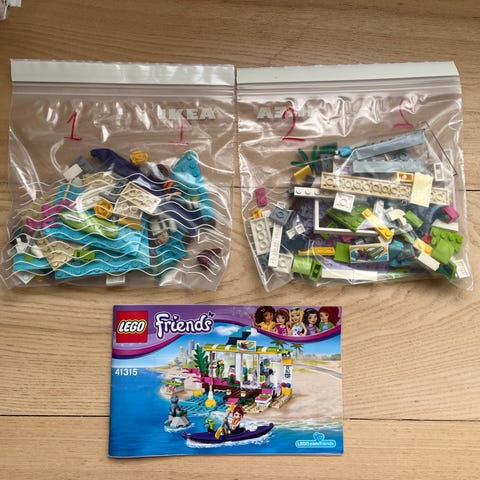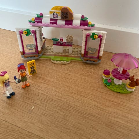 LEGO Friends legetøjssæt indeholder to figurer, en lille vogn med tilbehør som flasker og en scooter.