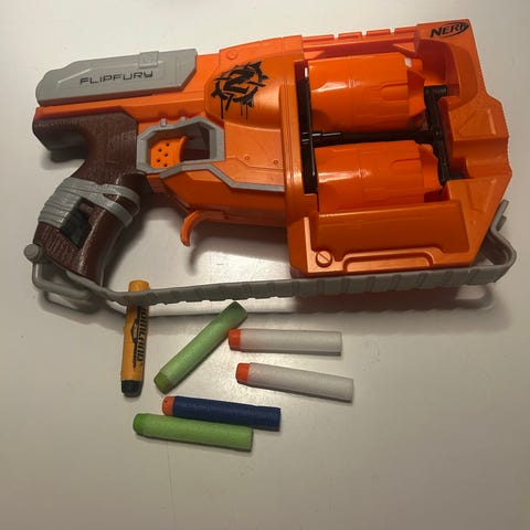Nerf Zombie Strike Hammershot blaster legetøjspistol i grøn, gul og sølv. Leveres med seks skumskud med blå spidser. Fremstillet i plastik. Egnet til leg og udendørs aktiviteter.