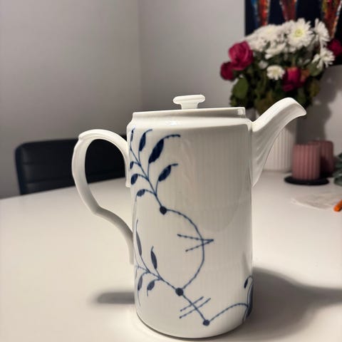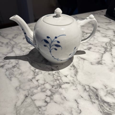 Royal Copenhagen Musselmalet tekande med låg i porcelæn. Tekanden har det karakteristiske blå Musselmalet mønster på hvid baggrund. Den har en rund form med håndtag og tud, samt et låg med knop. Tekanden er velegnet til servering af te.