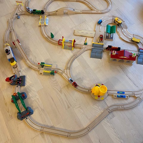 LEGO DUPLO Togbane sæt med forskellige togdele, skinner og tilbehør. Indeholder flere tog, kurvede og lige skinner samt skifte- og signaldele. Med 3 tog