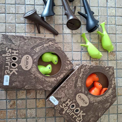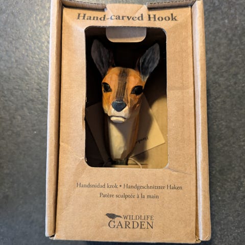 Tre frakkeknager formet som hjortehoveder, to af dem er malet metal, lidt tunge i det (en af disse skal have ny skrue). Den tredje føles mere som plastik.