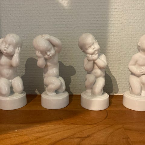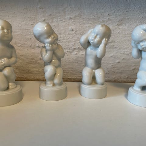 Sæt af fire porcelænsfigurer, hver forestillende en baby i forskellige positurer. Figurerne er hvide og står på runde sokler. Velegnet til dekorative formål.