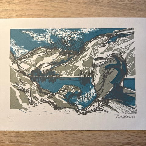Fritz Staibolsen indrammet kunsttryk med motiv af kirke omgivet af træer. Værket er indrammet i en brun træramme. Mål: cirka 50 cm x 37 cm. Signeret og dateret 1958-1922 på bagsiden.