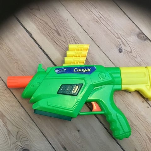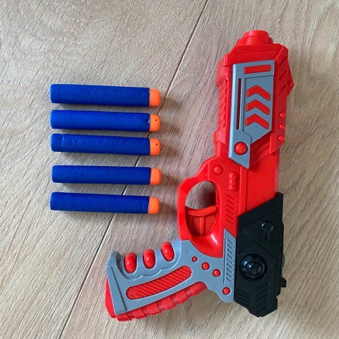 Rigtig god nerf gun lidt brugt. Har sigtekorn og forlænger stykke foran. 12 skud inkluderet :)
