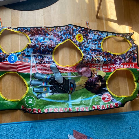 net til bolde fremstillet i rød og hvid materiale. Nettet er designet til at hænge på en dør, krog etc og er velegnet til udendørs eller indendørs brug.