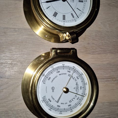 Minisæt i tre dele med barometer, ur og kombineret termometer/hygrometer alle i messinghus.