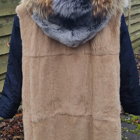 Fejlkøb. Super flot frakke i dyb blå. ca. str. 38. Frakken er sammensat af to, hvor den inderste er en lækker blød pelsfrakke af kanin og vaskebjørn.