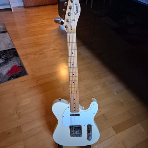 Squier SP-10 elektrisk guitarforstærker med kontrolpanel til volumen, diskant, bas og hovedtelefonudgang. Sort farve med metalgitter foran og input til elektrisk guitar.