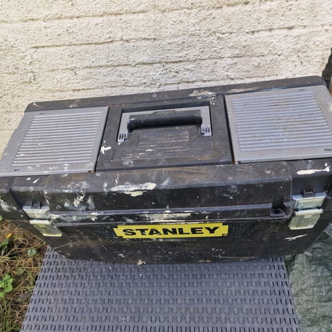 Blå Værktøjskasse i metal / jern. Måler ca 60 gange 30 cm.