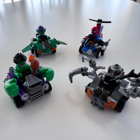 LEGO Marvel Super Heroes legetøjssæt med figurer og køretøjer fra Marvel-universet. Sættet indeholder en grøn bil, en motorcykel og figurer og lille fly, herunder Spider-Man. Legetøjet er designet til leg og samling. Der medfølger originale manualer.