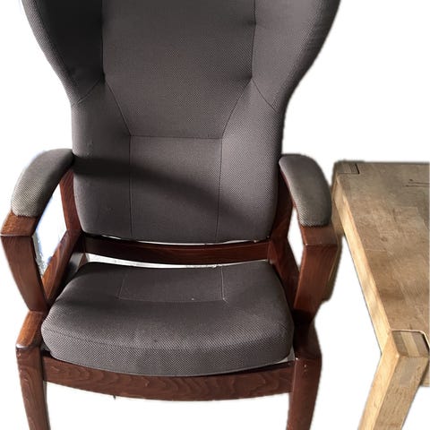 Dejlig lænestol i træ og uld. Den har nogle år på bagen, men er meget behagelig at sidde i og fungerer fint. Ingen pletter. Sædet er slidt, det kan ombetrækkes eller dækkes.