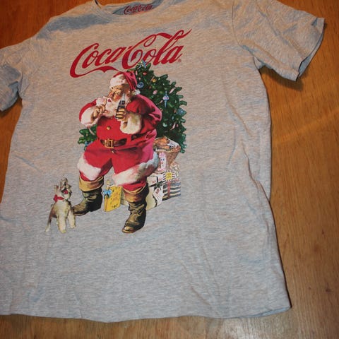 Coca-Cola T-shirt i grå farve til herre, størrelse S. T-shirten har et tryk af julemanden, perfekt til afslappet brug.