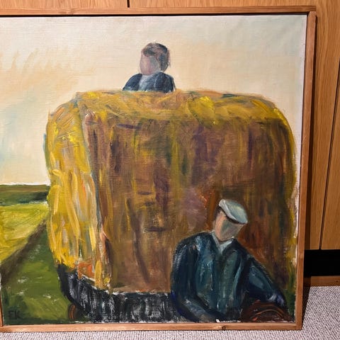 Maleri størrelse H44x B64 cm plus ramme. Er indrammet i en guldfarvet